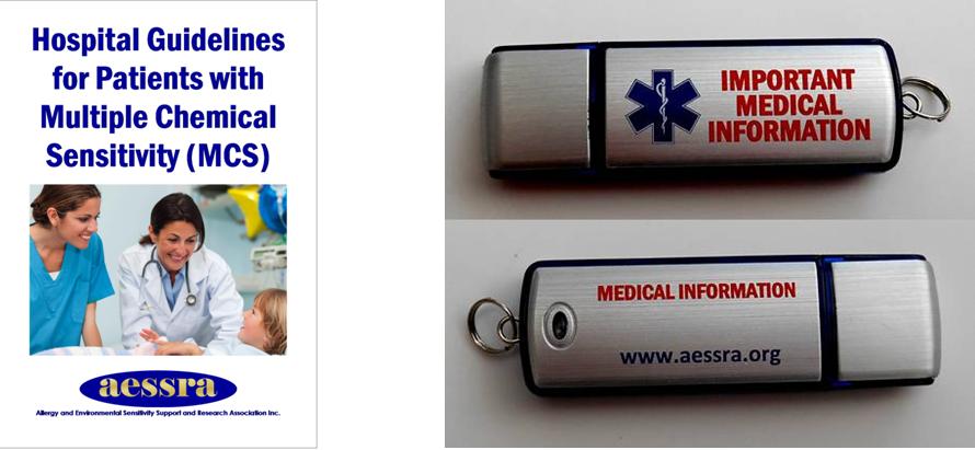 AESSRA Inc.'s 12 A4 page Hospital Guidelines for Patients with Multiple Chemical Sensitivity is available to members as a booklet printed with low VOC soy ink on recycled paper and as a pdf on a USB drive with space for personal medical information. Contents: Emergency, Hospital staff, Admission, Babies and children, Patient’s room, Medications, Medical devices and surgery, Diet, Cleaning, Non-toxic and fragrance-free cleaning products, Non-toxic and fragrance-free personal care products, Pesticides, Further information.